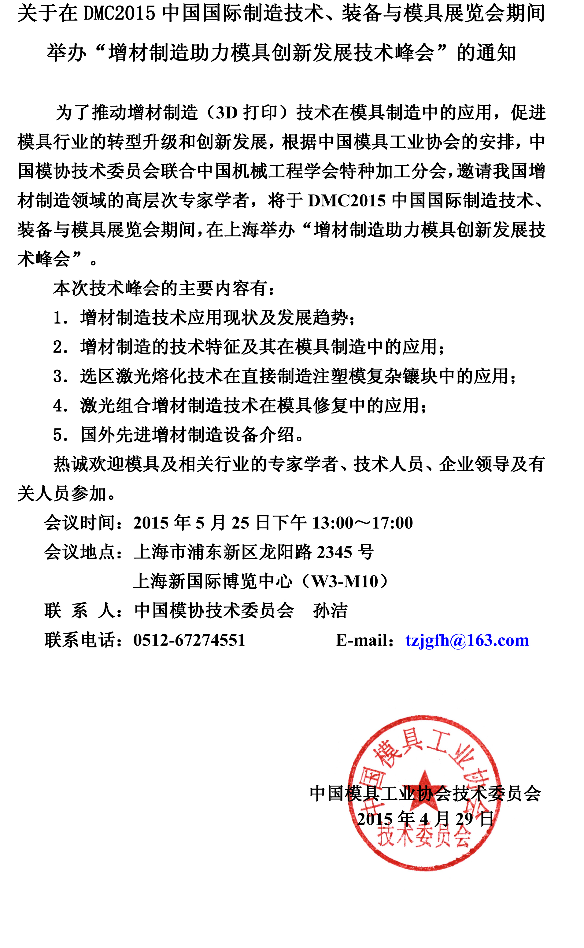 關于在DMC2015中國國際制造技術、裝備與模具展覽會期間舉辦“增材制造助力模具創新發展技術峰會”的通知