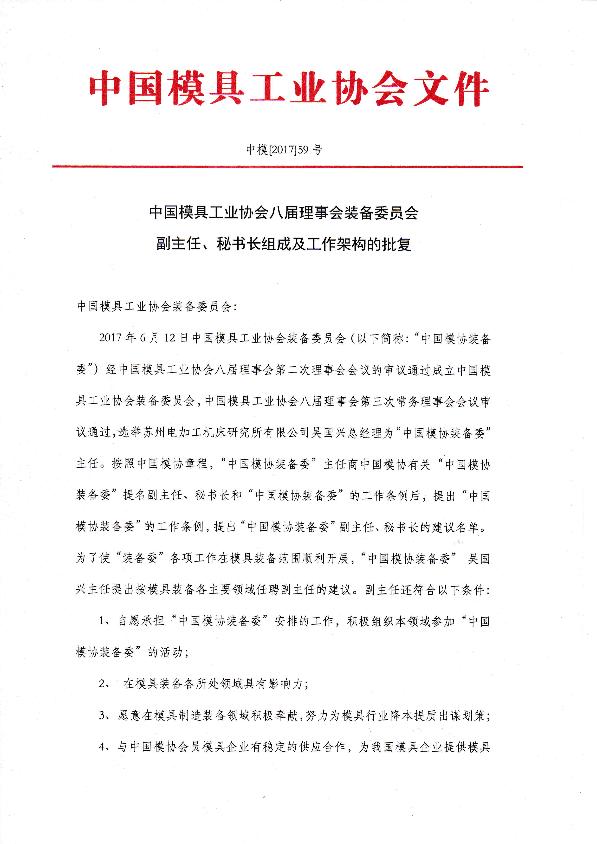中國模具工業協會裝備委員會副主任、秘書長組成及工作架構的批復