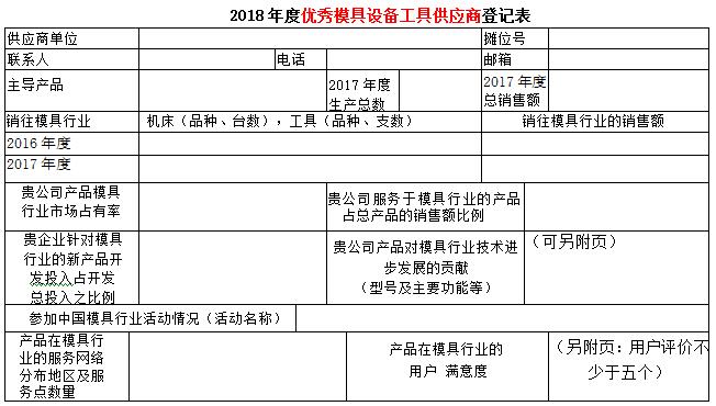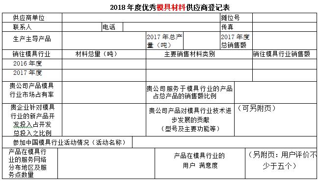 現(xiàn)代模具工業(yè)是高技術(shù)背景下的資金和技術(shù)密集型工業(yè)。隨著模具行業(yè)的發(fā)展,現(xiàn)代模具要實(shí)現(xiàn)數(shù)字化設(shè)計(jì)、數(shù)字化制造、數(shù)字化管理、數(shù)字化生產(chǎn)流程來實(shí)現(xiàn)模具工業(yè)的現(xiàn)代化。模具材料是降本提質(zhì)增效的重要至關(guān)領(lǐng)域,為了服務(wù)模具企業(yè)提高模具材料使用,提升使用的能力, 第十八屆中國(guó)國(guó)際模具技術(shù)和設(shè)備展覽會(huì)主辦單位之一的中國(guó)模具工業(yè)協(xié)會(huì)十分注重展覽會(huì)的內(nèi)涵,在歷屆展覽會(huì)上均開展了對(duì)展覽會(huì)展品的評(píng)述工作,至今已成定式。為了更好地為模具企業(yè)提供多元的服務(wù),為企業(yè)的模具制造加工解決方案提供保障,進(jìn)一步推動(dòng)模具及模具相關(guān)行業(yè)交流與互動(dòng),在第十八屆中國(guó)國(guó)際模具技術(shù)和設(shè)備展覽會(huì)期間,中國(guó)模具工業(yè)協(xié)會(huì)委托中國(guó)模具工業(yè)協(xié)會(huì)模具材料委員會(huì),本著自愿的原則,依據(jù)供應(yīng)商裝備水平,在模具行業(yè)服務(wù)水平、市場(chǎng)占有率的高低、對(duì)模具行業(yè)服務(wù)滿意等行業(yè)貢獻(xiàn)指標(biāo),并結(jié)合模具企業(yè)的意見開展評(píng)定優(yōu)秀模具材料供應(yīng)商活動(dòng),活動(dòng)不收取參評(píng)單位任何費(fèi)用。現(xiàn)將優(yōu)秀模具材料供應(yīng)商登記表發(fā)給你們,請(qǐng)予認(rèn)真填寫,盡快返回中國(guó)模具工業(yè)協(xié)會(huì)模具材料委員會(huì) 遲宏宵 收。