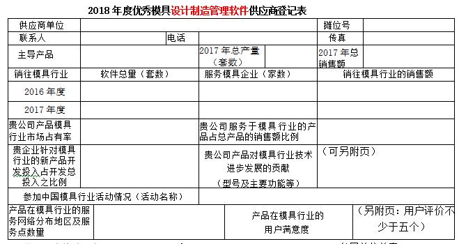 現(xiàn)代模具工業(yè)是高技術(shù)背景下的資金和技術(shù)密集型工業(yè)。隨著模具行業(yè)的發(fā)展,現(xiàn)代模具要實(shí)現(xiàn)數(shù)字化設(shè)計(jì)、數(shù)字化制造、數(shù)字化管理、數(shù)字化生產(chǎn)流程來實(shí)現(xiàn)模具工業(yè)的現(xiàn)代化。模具軟件是降本提質(zhì)增效的重要至關(guān)領(lǐng)域,為了服務(wù)模具企業(yè)提高模具軟件工具使用效率,提升使用能力,第十八屆中國(guó)國(guó)際模具技術(shù)和設(shè)備展覽會(huì)主辦單位之一的中國(guó)模具工業(yè)協(xié)會(huì)十分注重展覽會(huì)的內(nèi)涵,在歷屆展覽會(huì)上均開展了對(duì)展覽會(huì)展品的評(píng)述工作,至今已成定式。為了更好地為模具企業(yè)提供多元的服務(wù),為企業(yè)的模具制造加工、集成、協(xié)同解決方案提供保障,進(jìn)一步推動(dòng)模具及模具相關(guān)行業(yè)交流與互動(dòng),在第十八屆中國(guó)國(guó)際模具技術(shù)和設(shè)備展覽會(huì)期間,中國(guó)模具工業(yè)協(xié)會(huì)委托中國(guó)模具工業(yè)協(xié)會(huì)數(shù)字化信息化委員會(huì)(數(shù)信委),本著自愿的原則,依據(jù)供應(yīng)商軟件水平,在模具行業(yè)服務(wù)能能力、市場(chǎng)占有率的高低、對(duì)模具行業(yè)服務(wù)滿意等行業(yè)貢獻(xiàn)指標(biāo),并結(jié)合模具企業(yè)的意見開展評(píng)定優(yōu)秀模具設(shè)計(jì)制造管理軟件供應(yīng)商活動(dòng),活動(dòng)不收取參評(píng)單位任何費(fèi)用。現(xiàn)將優(yōu)秀模具設(shè)計(jì)制造管理軟件供應(yīng)商登記表發(fā)給你們,請(qǐng)予認(rèn)真填寫, 盡快返回中國(guó)模具工業(yè)協(xié)會(huì)數(shù)字化信息化委員會(huì) 魏青收。