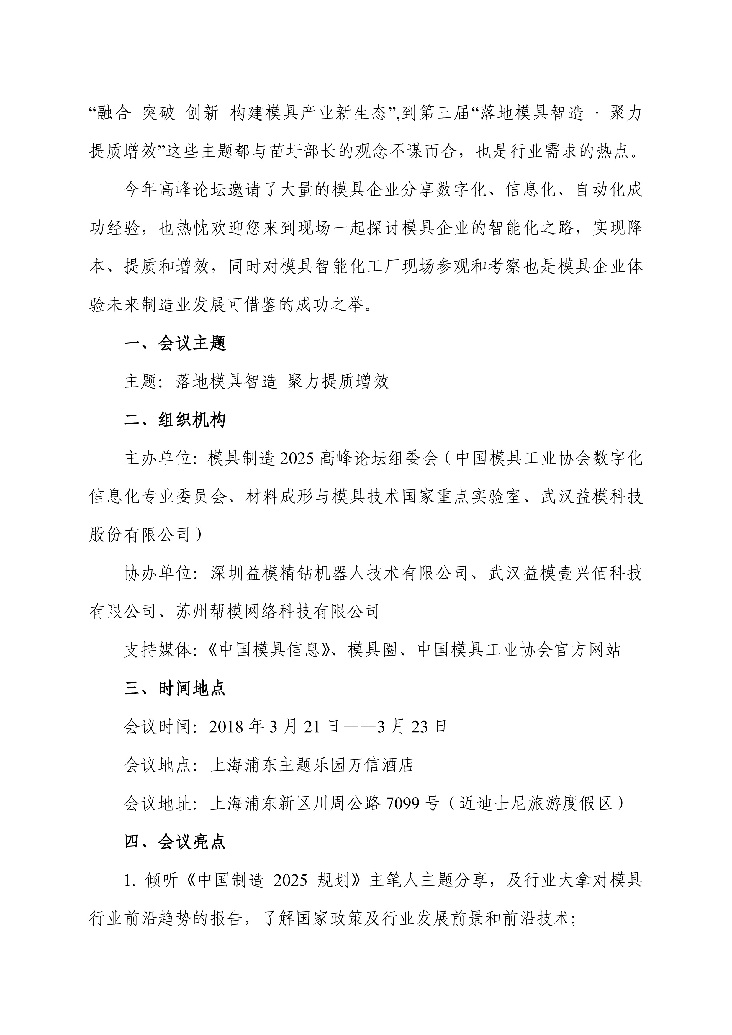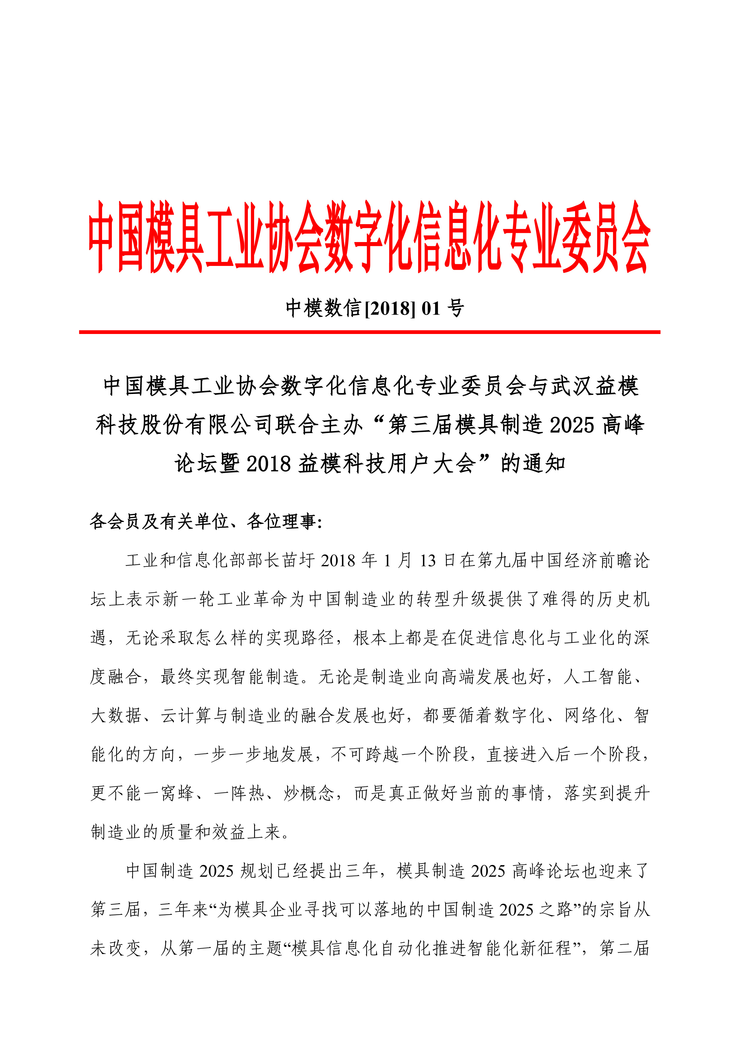 中國模具工業(yè)協(xié)會數(shù)字化信息化專業(yè)委員會與武漢益模科技股份有限公司聯(lián)合主辦“第三屆模具制造2025高峰論壇暨2018益模科技用戶大會”的通知