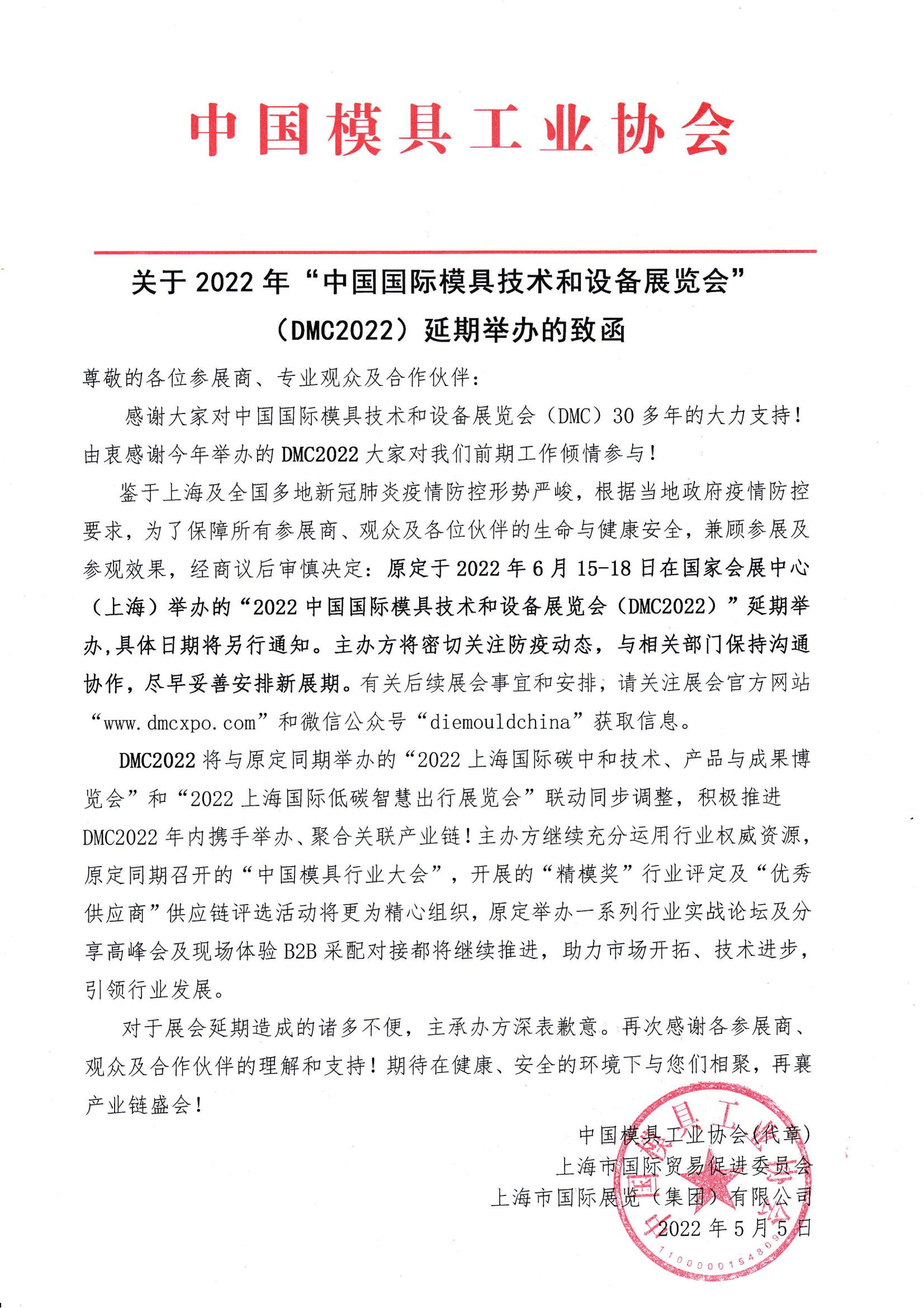 關(guān)于2022年“中國國際模具技術(shù)和設(shè)備展覽會”(DMC2022)延期舉辦的致函