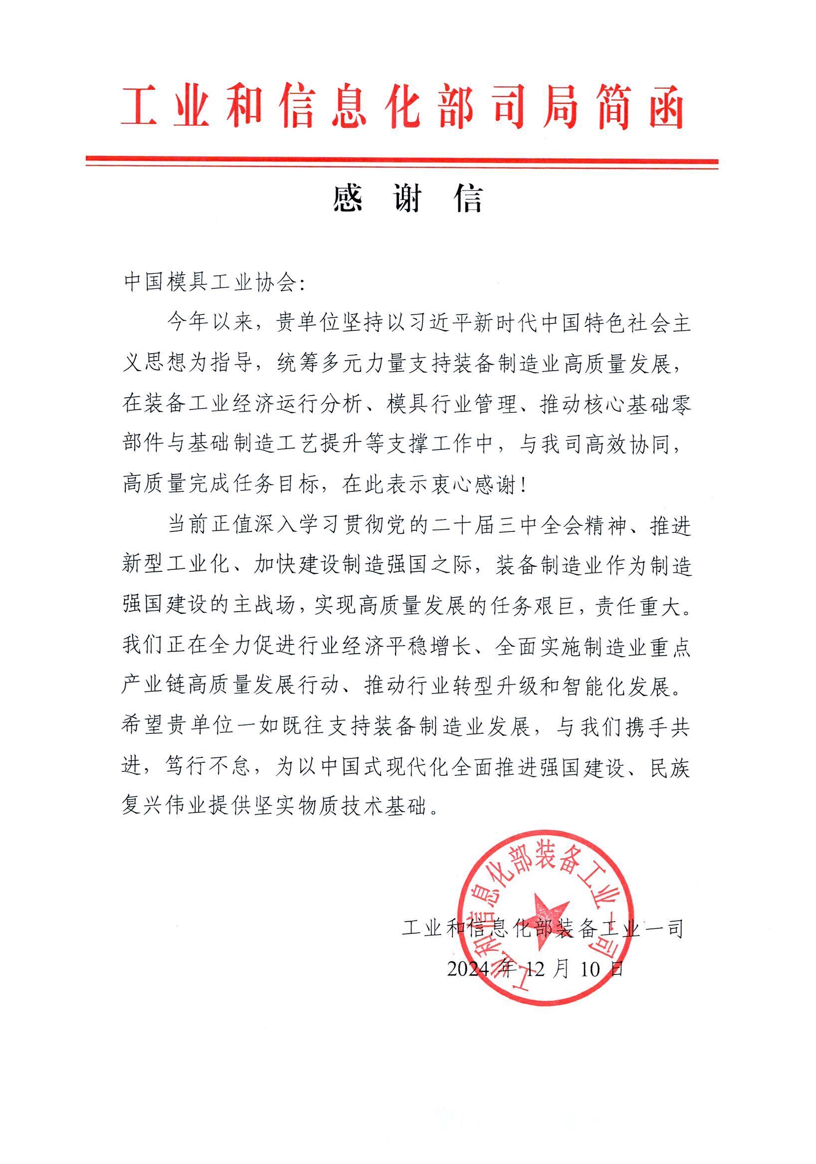 工業和信息化部裝備工業一司感謝信
