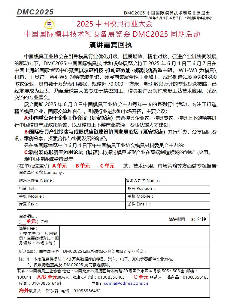 DMC2025中國模具行業(yè)大會演講嘉賓回執(zhí)
