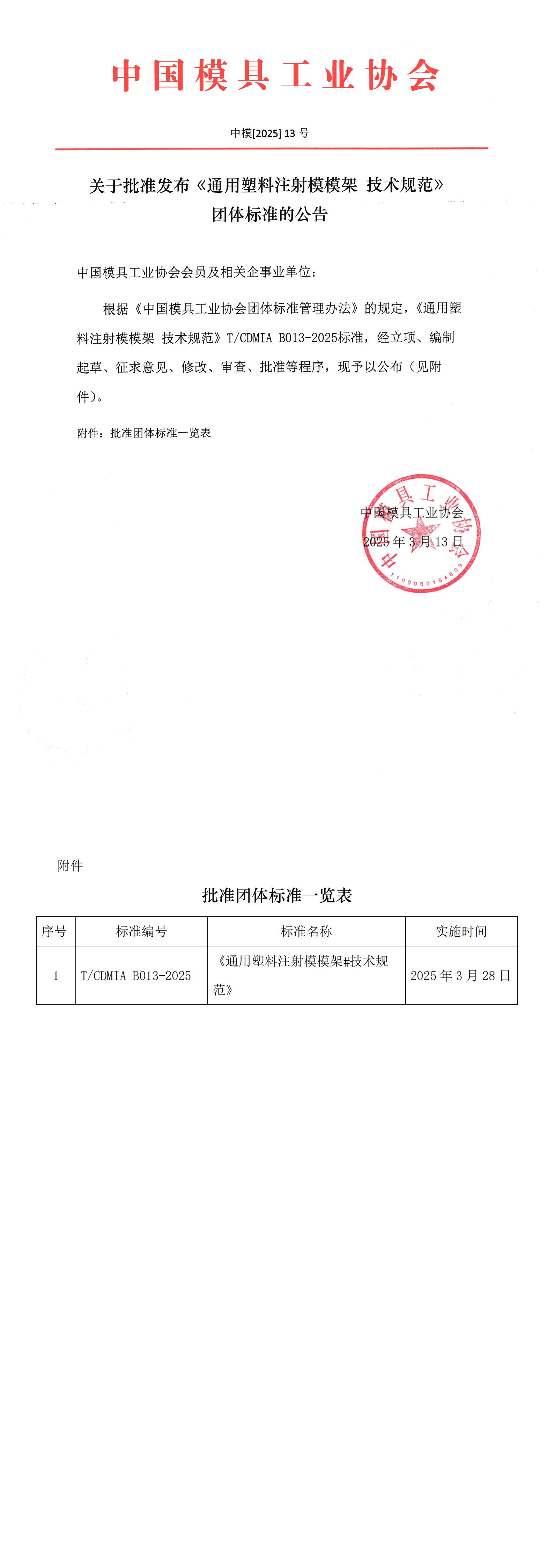 關(guān)于批準發(fā)布《通用塑料注射模模架 技術(shù)規(guī)范》團體標準的公告
